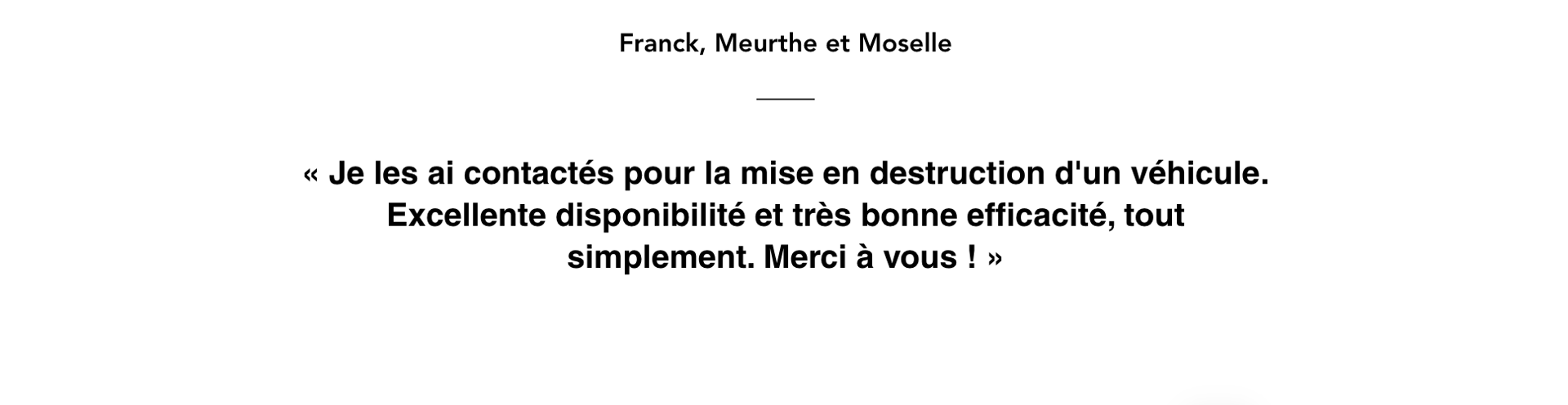 « Je les ai contactés pour la mise en destruction d'un véhicule. Excellente disponibilité et très bonne efficacité, tout simplement. Merci à vous ! »